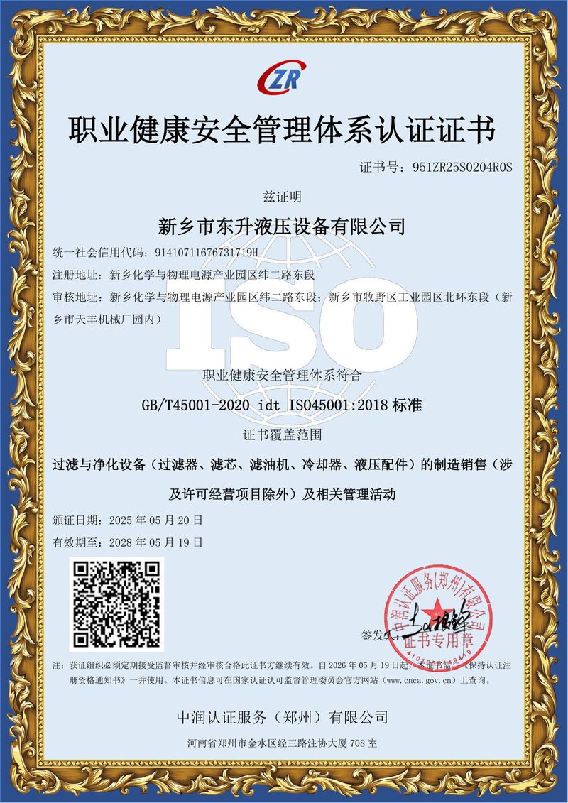 職業(yè)健康安全管理體系認證證書